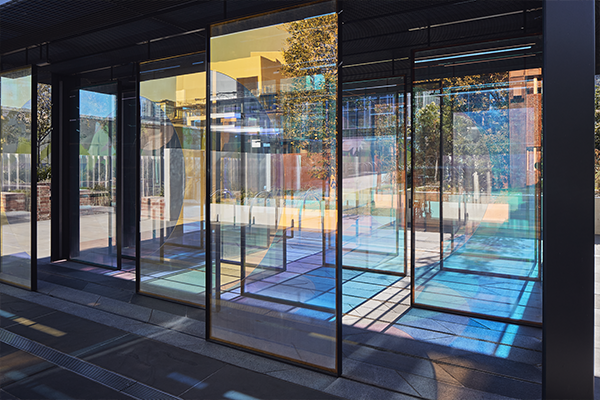 The sliding dichroic glass screens merge traditional Japanese shoji screens with Bauhaus-inspired color play. Visitors can interact with the sliding panels to create various contrasts of color, shadow, and pattern, experiencing the pavilion as a playground, maze, or sanctuary.
