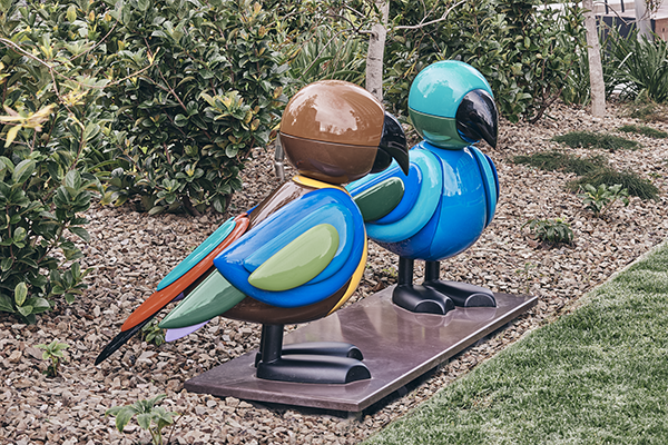 The sculptural birds are modeled on the Red Rumped Parrot (Psephotus haematonotus), also known as the red-backed parrot or grass parrot, a common bird of south-eastern Australia.