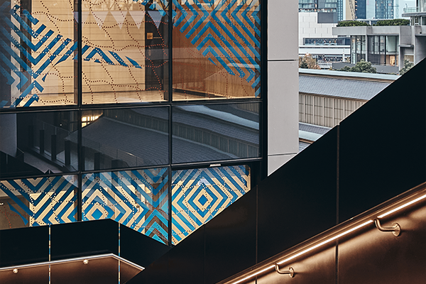 Located in Melbourne Quarter Square, the precinct and beyond are abstracted by the glass artwork that references the cellular structure of river reeds. The reeds are a central part of Maree’s practice, and continue the historical practice of Louisa Briggs, who used the reeds to create Welcome to Country necklaces.