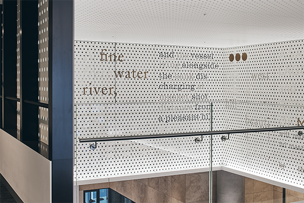 The artwork on the upper walls of the foyer features a typographical interpretation of a letter from Captain John Lancey to his employer, the co-founder of Melbourne, John Fawkner in 1835, the year Melbourne was founded.